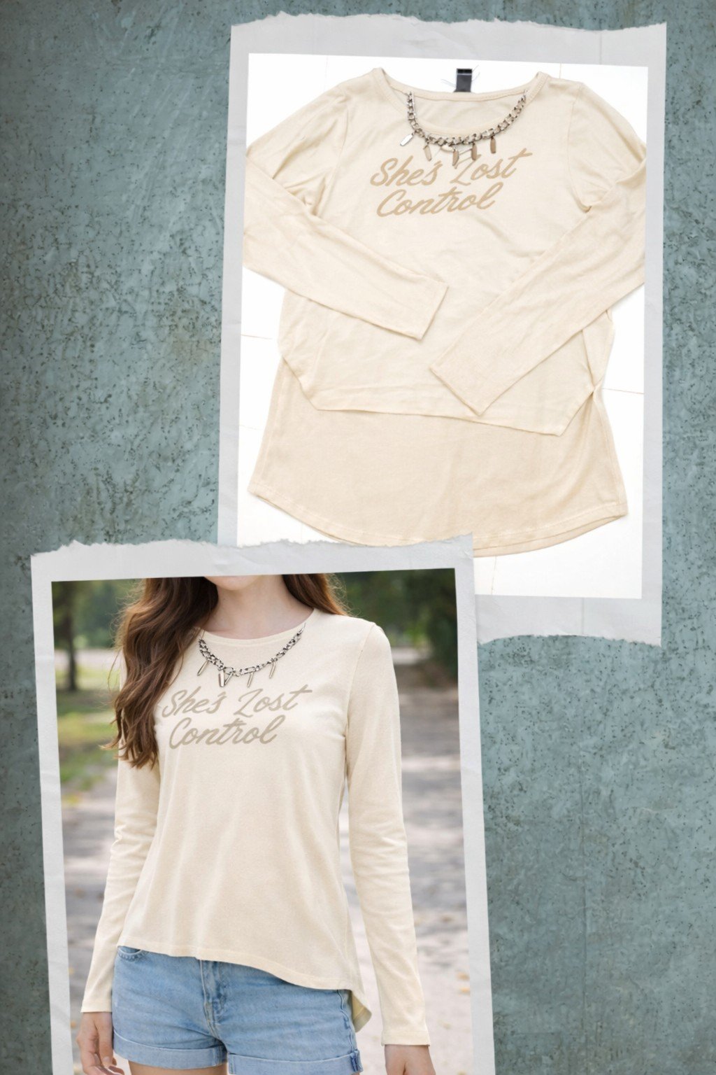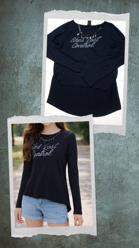 Esta blusa possui uma composicao de 96% viscose e 4% elastano, o que garante um toque extremamente macio, leveza e a elasticidade necessaria para um ajuste confortavel ao corpo.Aqui estao os detalhes principais da peca:Design e Detalhes VisuaisEstampa Frontal: Apresenta a frase “She’s Lost Control” em uma caligrafia cursiva prateada com acabamento em brilho.Decote Ornamentado: Possui um decote canoa realcado por uma corrente escura aplicada com pingentes metalicos, conferindo um estilo moderno e dispensando o uso de colares.Cor: Preto classico, ideal para diversas combinacoes.Modelagem e CorteCorte Mullet: A modelagem e alongada, sendo propositalmente mais comprida nas costas do que na frente.Fendas Laterais: Conta com fendas nas laterais que proporcionam um caimento fluido e maior liberdade de movimento nos quadris.Mangas: Compridas e ajustadas, perfeitas para dias de meia-estacao.Dicas de UsoDevido ao seu material de viscose com elastano, a peca nao amassa facilmente e mantem o caimento iPCA DE ALTA QUALIDADEB PODENDO TIRAR O COLOAR E COLOCAR DE VOLTA Impecavel durante todo o dia. Combina muito bem com:Leggings claras ou brancas para um visual mais sofisticado.Shorts jeans e tenis para um look juvenil e descontraido. juvenil e descontraido.
