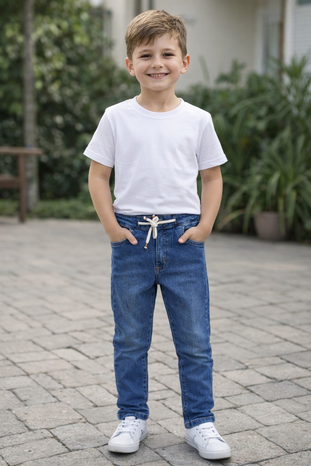 tecido jeans 100% algodaoA calca e um modelo infantil em jeans azul medio, com lavagem uniforme e leve efeito mais claro nas areas frontais, que traz um visual moderno e casual. Possui corte reto levemente ajustado, garantindo bom caimento no corpo da crianca sem ficar apertado.O cos e com elastico interno e cordao decorativo claro, que alem de estiloso ajuda no ajuste confortavel. Na parte frontal ha bolsos tradicionais estilo jeans, e a peca apresenta costuras aparentes em tom contrastante, valorizando o acabamento.A barra e simples, sem punho, deixando o modelo mais versatil para combinar com tenis. O tecido aparenta ter boa flexibilidade, ideal para conforto e mobilidade no dia a dia infantil. ???
