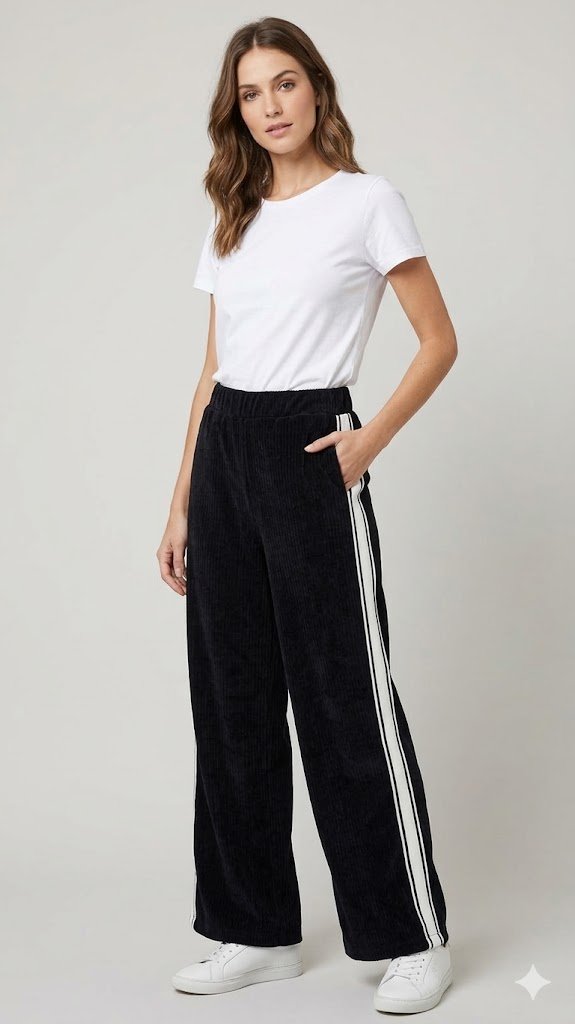 Calca Pantalona em Veludo Cotele com Listra LateralElevando o estilo comfy a um novo patamar, esta calca pantalona combina a sofisticacao da textura do veludo com a modernidade das listras esportivas. E a peca perfeita para quem busca um visual marcante sem abrir mao do conforto absoluto.Tecido Premium: Confeccionada em veludo cotele de toque macio, que proporciona um caimento fluido e elegante.Design Alongador: O corte pantalona (pernas largas) aliado as listras verticais brancas nas laterais cria um efeito visual que alonga a silhueta.Conforto Inteligente: Possui cos elastico reforcado, garantindo ajuste perfeito a cintura sem apertar.Estilo Versatil: Vai do tenis e t-shirt para um look casual/urbano, ate um salto e blazer para uma proposta hi-lo sofisticada75% DE ALGODAO 25% DE POLIESTER.