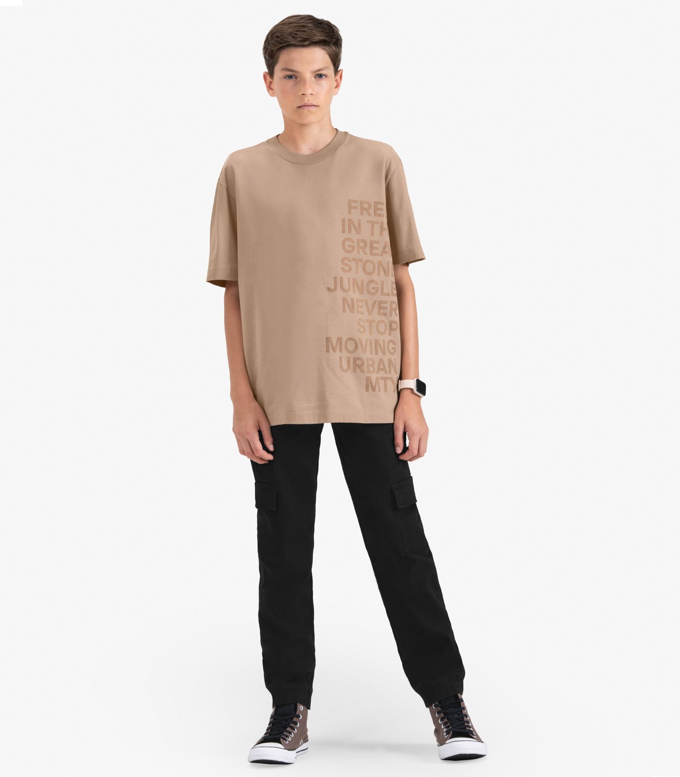 Camiseta juvenil masculina confeccionada em meia malha, super confortavel e ideal para o dia a dia. Possui gola com acabamento em friso resistente, estampa localizada com estilo urbano e moderno, alem de bainhas reforcadas com costura decorativa nas mangas e na barra. Perfeita para quem busca praticidade e estilo em uma unica peca. Traducao de Estampa: Livre na Grande Selva de Concreto.COMPOSICAO:PECA TOTAL 100% ALGODAOPARA MAIS INFORMACOES ENTRE EM CONTATO CONOSCO PELO WHATSAPP