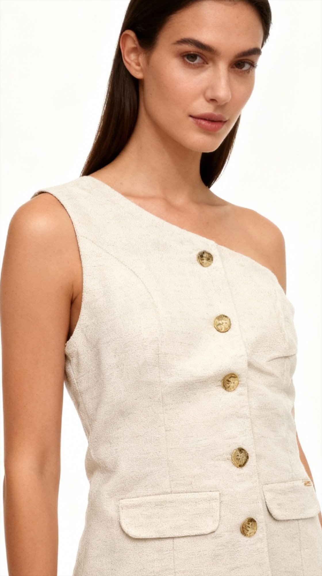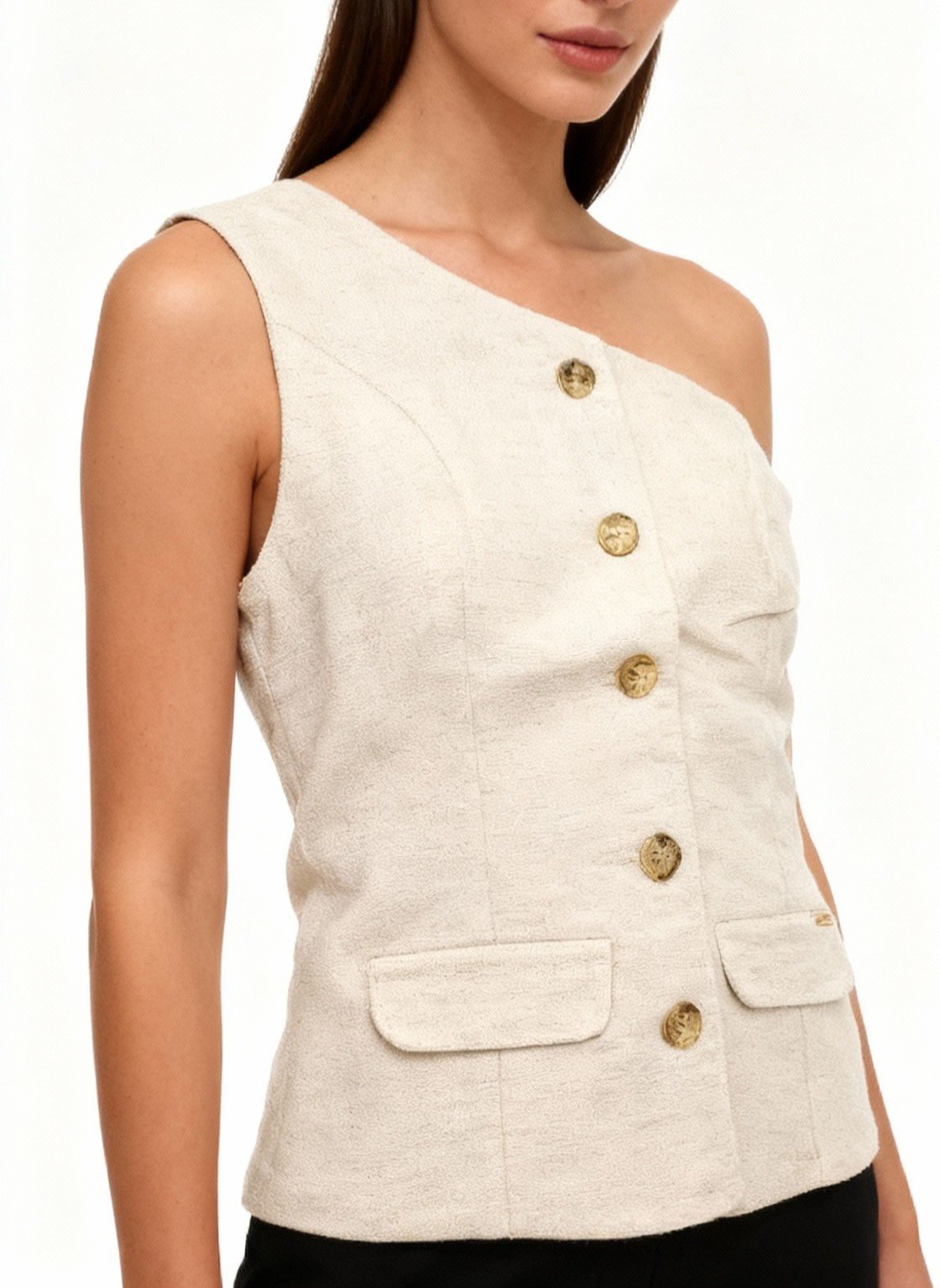 DescricaoColete Nude em Linho com Viscose. 65%ALGODAO23%VISCOSE 2% ELASTAN0 Modelo tipo peplum, um ombro so, recortes , detalhes de lapelas e fechamento frontal em botoes . Ideal para usar com short ou calca de cos alto. Look Chic.M BUSTO ;41CMCINTURA;39CM COMPRIMENTO; 50CMG BUSTO; 45CMCINTURA;42CM COMPRIMENTO 57CMGG BUSTO; 47CMCINTURA 44CMCOMPRIMENTO;58CM