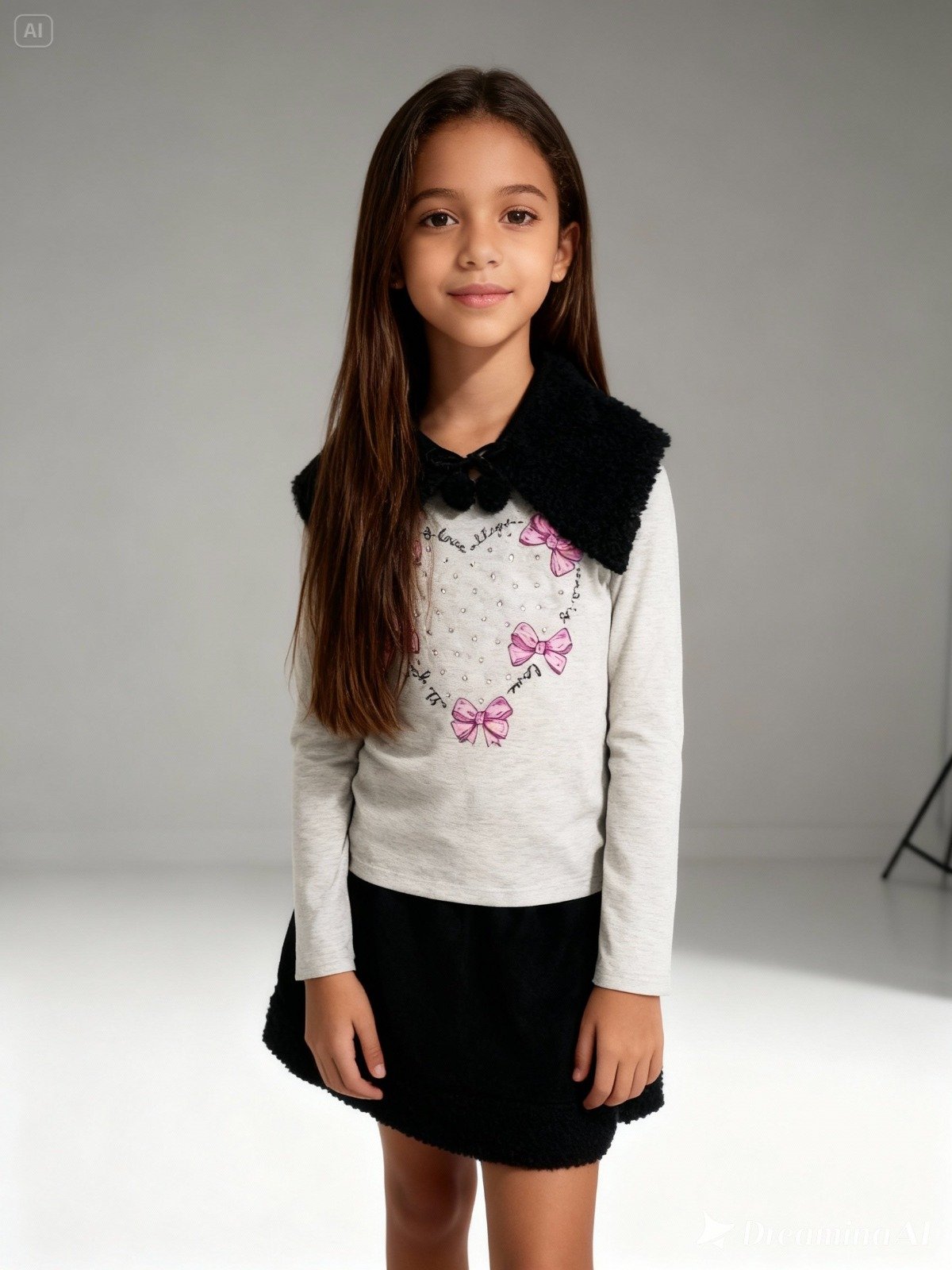 BLUSA 100% ALGODAO SAIA100% POLIESTERDestaques:Design 2 em 1: Use com ou sem a gola para criar looks diferentes.Conforto e Estilo: Pecas macias que permitem total liberdade de movimento.Detalhes que Encantam: Estampa delicada e gola de pelucia que fazem toda a diferenca.Opcao 2 (Detalhada e Elegante)Titulo: Elegancia Casual: Conjunto com Gola de Pelucia e Detalhes de CoracaoEste conjunto e a traducao perfeita de charme e conforto para meninas que amam moda.Blusa com Toque Romantico: A blusa de manga longa, em um tom neutro de cinza mescla, serve de tela para uma linda estampa de coracao formada por lacos cor-de-rosa e a palavra “love”. O detalhe especial fica por conta da gola de pelucia preta, que alem de ser super macia, adiciona uma camada de elegancia e pode ser removida para um visual mais casual.Saia Versatil: A saia preta possui um tecido texturizado e confortavel, com um caimento leve que combina com tudo. E a peca-chave para um look pratico e arrumadinho.Ideal para qualquer ocasiao, este conjunto permite que sua menina expresse sua personalidade com um visual moderno e cheio de docura.