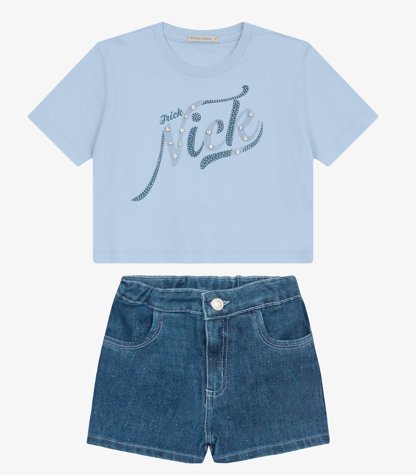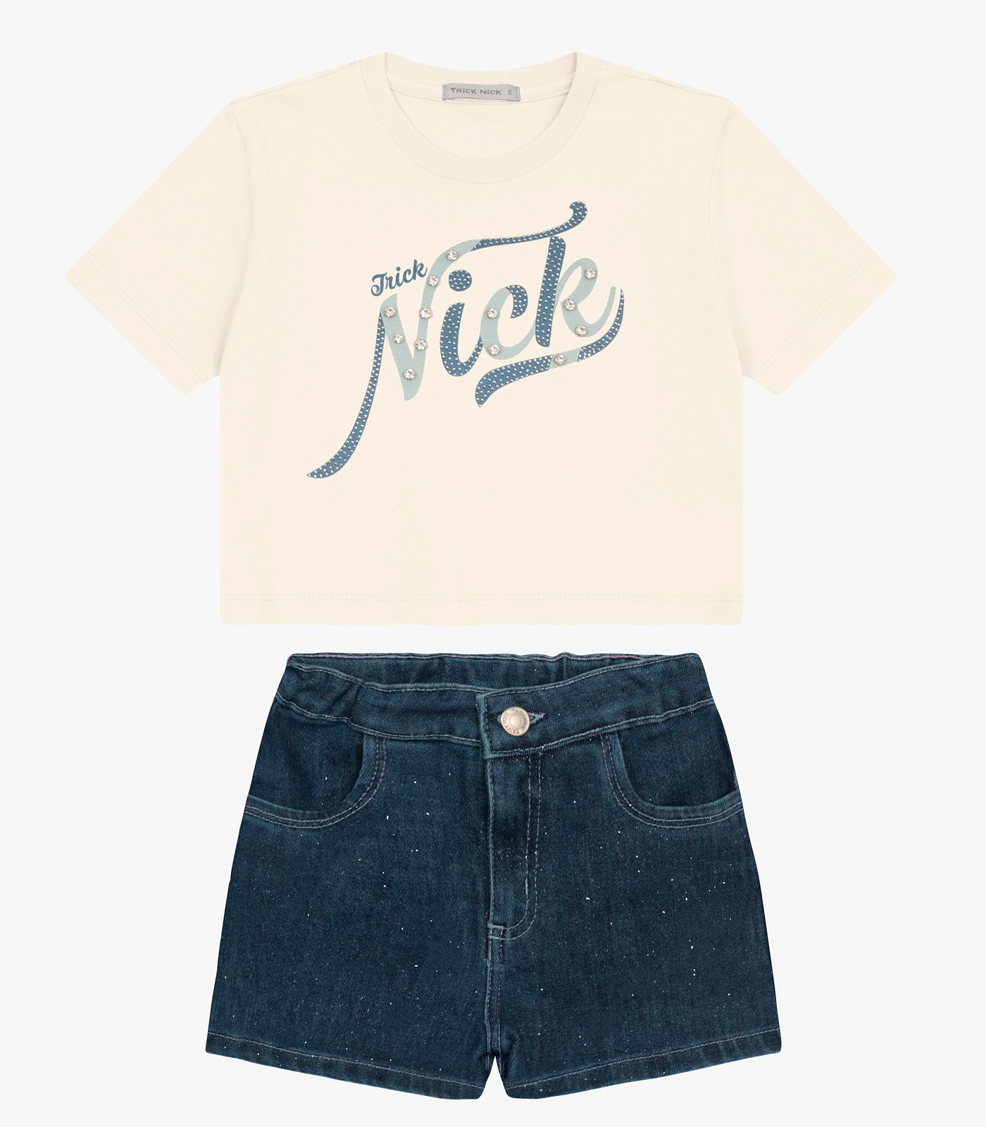 Conjunto Infantil Blusa com Shorts Trick Nick, confeccionado em meia malha e jeans de toque suave e delicado. A blusa apresenta decote em friso com reforco nas costas, cavas levemente deslocadas e estampa localizada com aplicacao de strass e rebites. Mangas e barra finalizadas em bainha fina garantem caimento impecavel. O shorts, com cos que valoriza a silhueta, possui bolsos funcionais, botao e barra com bainha. Um conjunto ideal para ocasioes especiais, unindo conforto, charme e sofisticacao.COMPOSICAO:PECA TOTAL 100% ALGODAOPARA MAIS INFORMACOES ENTRE EM CONTATO CONOSCO PELO WHATSAPP