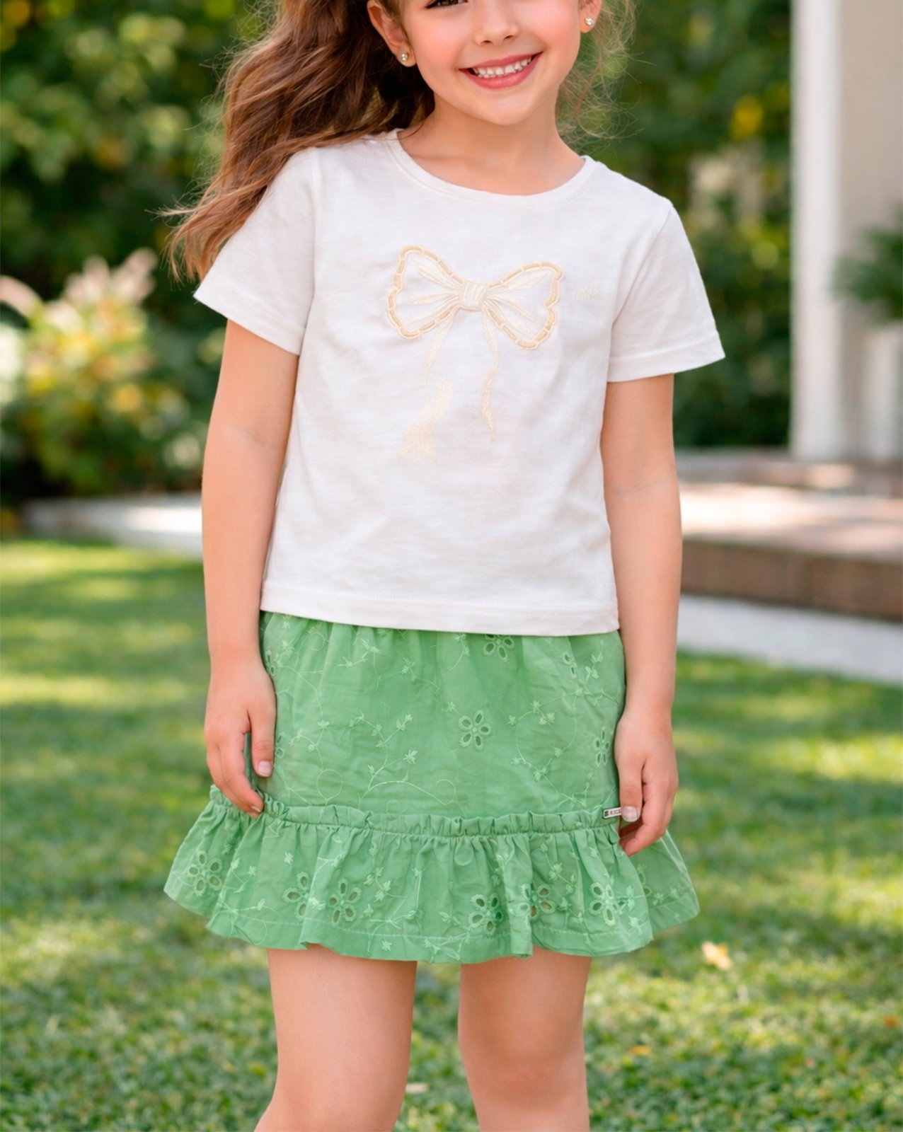 Conjunto infantil feminino Trick Nick, perfeito para compor looks delicados e cheios de charme no dia a dia. A blusa e confeccionada em malha macia na cor off white, com modelagem confortavel e destaque para o aplique frontal de laco bordado, que traz um toque elegante e encantador a peca.A saia e confeccionada em tecido leve na cor verde, com detalhes em bordado e acabamento em babado na barra, proporcionando movimento e um visual moderno. Possui cos com elastico, garantindo melhor ajuste ao corpo e maior conforto durante o uso.COMPOSICAO:100% ALGODAOPARA MAIS INFORMACOES ENTRE EM CONTATO CONOSCO PELO WHATSAPP