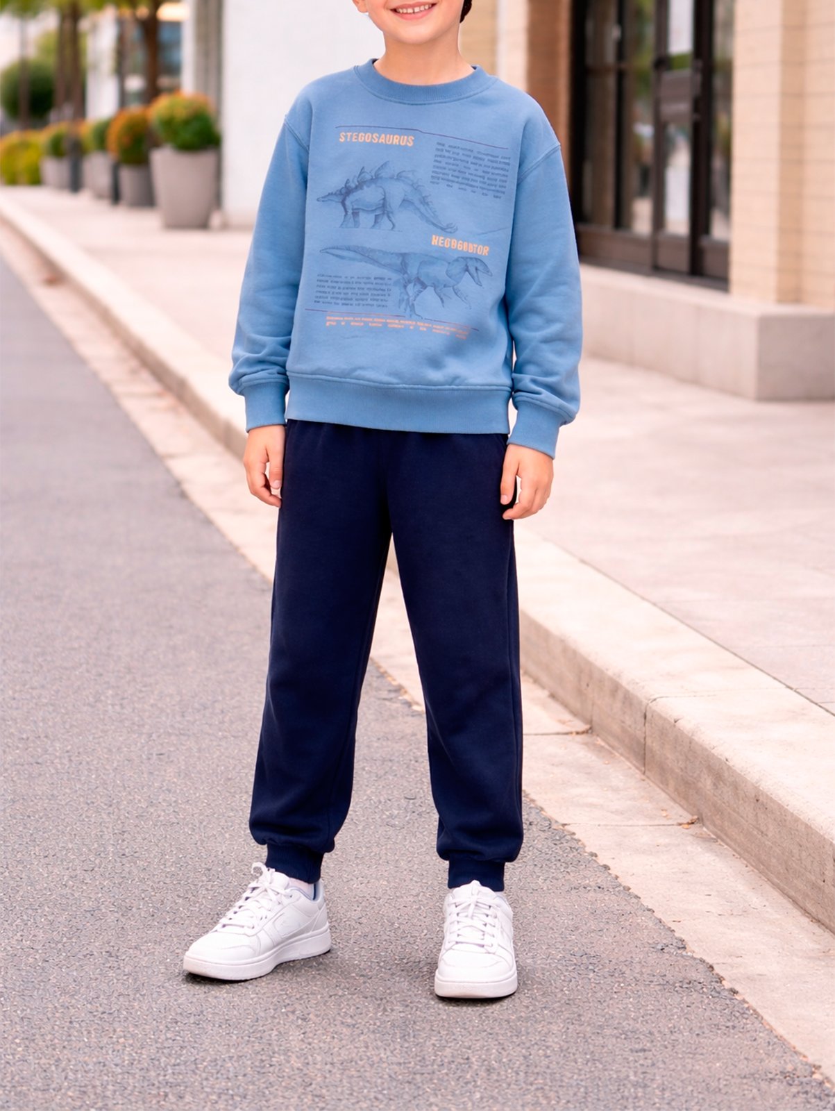O Conjunto Infantil Alakazoo e perfeito para acompanhar os meninos em todos os momentos do dia com muito conforto e estilo. Confeccionado em moletom macio e aconchegante, e ideal para os dias mais fresquinhos.O blusao possui modelagem confortavel, gola redonda e estampa moderna de dinossauro, que traz um visual divertido e cheio de personalidade. A calca lisa complementa o look com caimento soltinho, cos com elastico para melhor ajuste e nao possui bolsos, garantindo leveza e praticidade.Versatil e facil de combinar, e a escolha certa para passeios, escola ou momentos de lazer, unindo conforto, qualidade e o design exclusivo da Alakazoo.COMPOSICAO: 100% ALGODAOPARA MAIS INFORMACOES ENTRE EM CONTATO CONOSCO PELO WHATSAPP