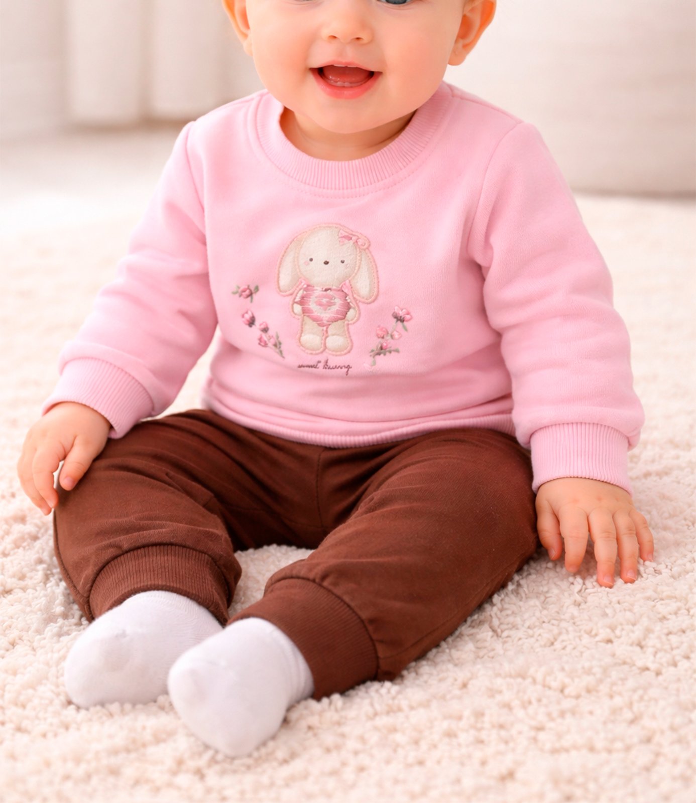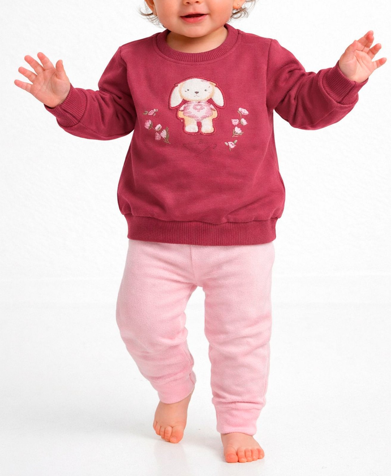 Conjunto infantil confeccionado em moletom macio e confortavel, ideal para manter os pequenos aquecidos nos dias mais fresquinhos. O modelo e composto por blusao de manga longa com gola redonda e acabamento em ribana, proporcionando melhor ajuste e conforto.O blusao possui estampa frontal delicada com aplique e detalhes que deixam a peca ainda mais charmosa. A calca conta com cos elastico, garantindo praticidade ao vestir e liberdade de movimentos para a crianca no dia a dia.COMPOSICAO97% ALGODAO 7% ELASTANOPARA MAIS INFORMACOES ENTRE EM CONTATO CONOSCO PELO WHATSAPP
