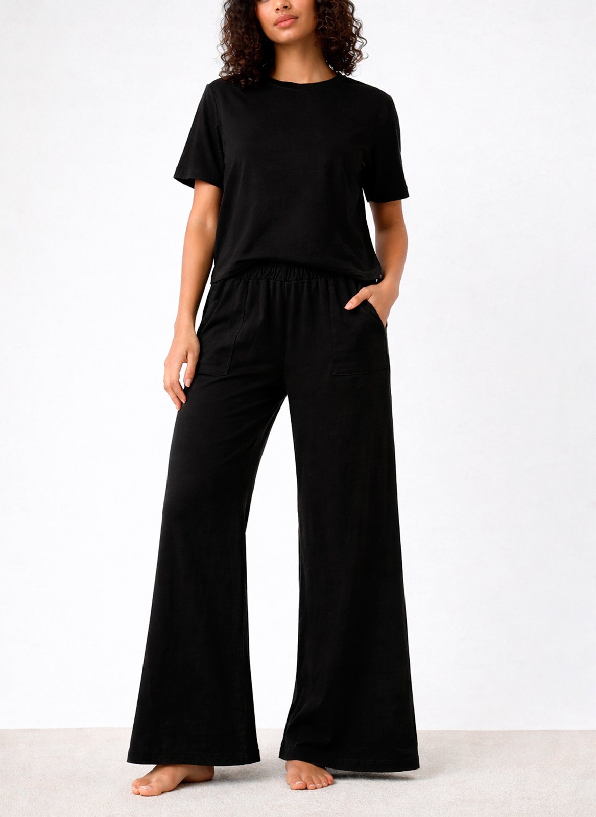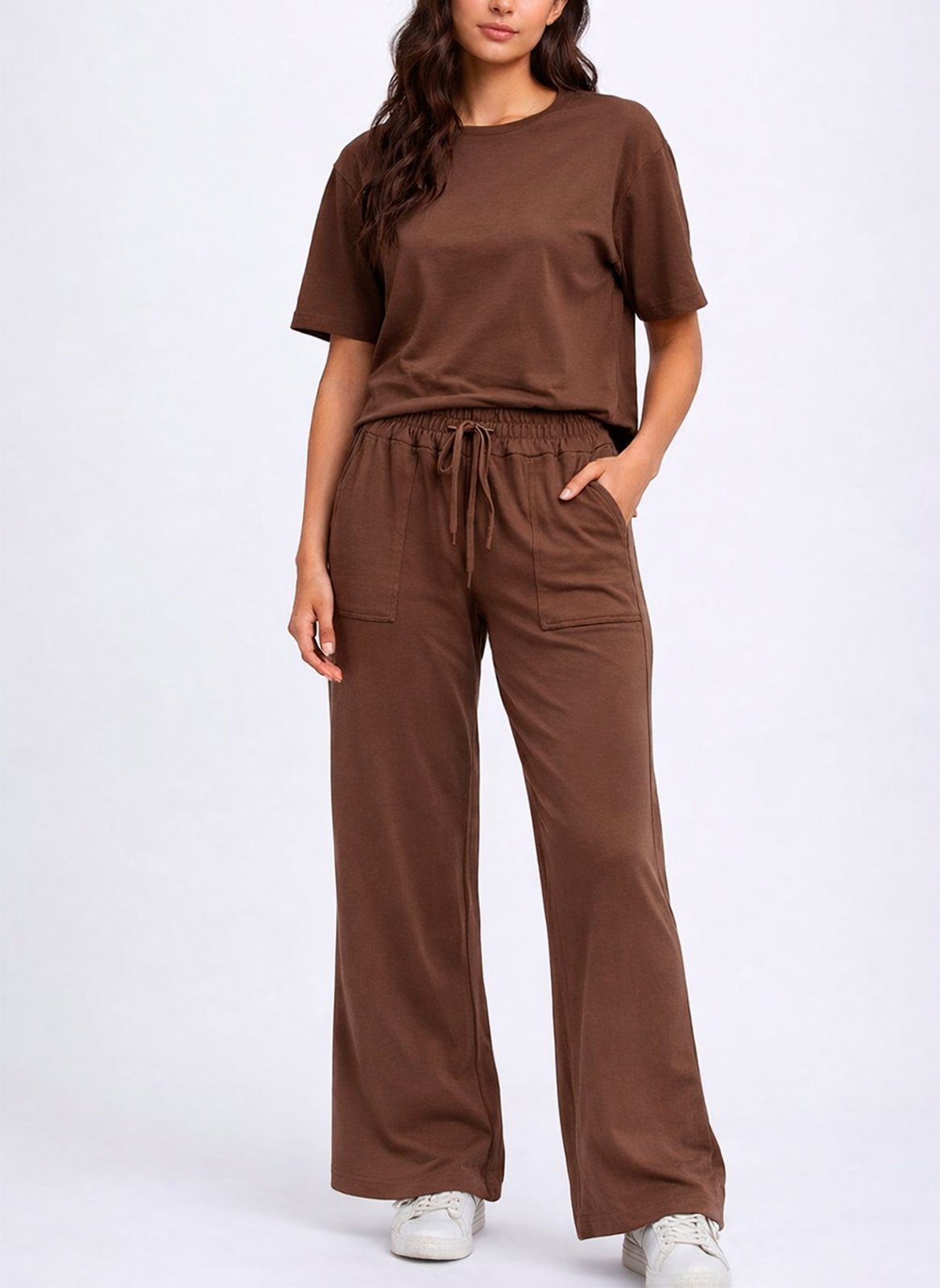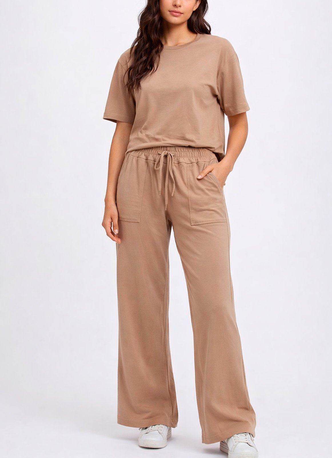 Conjunto feminino em molecotton que une conforto, estilo e versatilidade para o dia a dia. Composto por camiseta de manga curta e calca de modelagem ampla, e perfeito para quem busca um visual moderno sem abrir mao do bem-estar.A blusa possui caimento soltinho, gola redonda e acabamento delicado, garantindo leveza e liberdade de movimentos. A calca conta com elastico na cintura e cordao para ajuste, alem de bolsos frontais funcionais que agregam praticidade a peca. A modelagem wide leg traz um toque atual e elegante ao look.Ideal para momentos de lazer, trabalho informal ou producoes casuais cheias de personalidade. Combine com tenis para um visual despojado ou aposte em acessorios para uma proposta mais sofisticada.COMPOSICAO:95% ALGODAO 5% ELASTANOPARA MAIS INFORMACOES ENTRE EM CONTATO CONOSCO PELO WHATSAPP