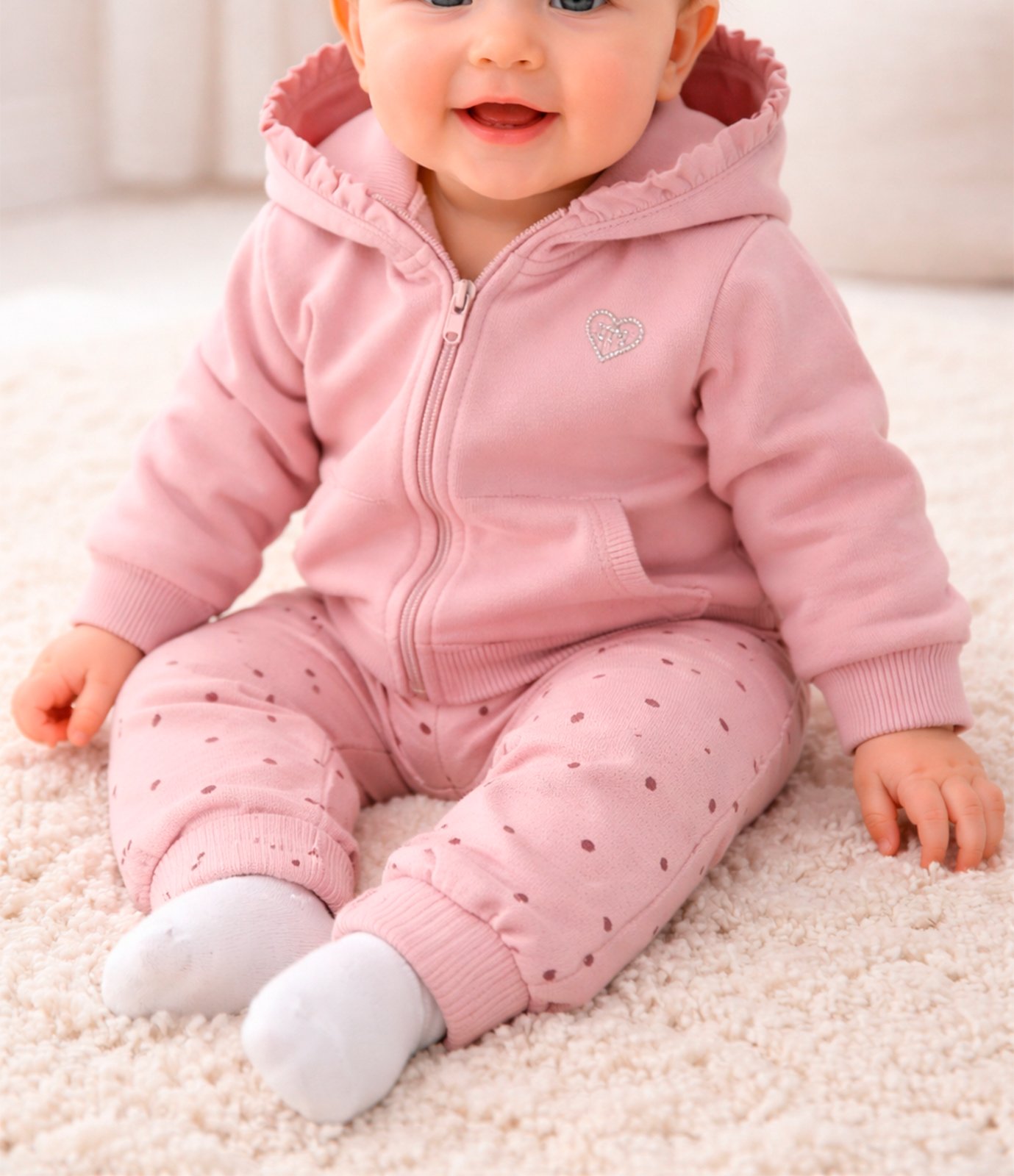 Conjunto infantil para bebe confeccionado em moletom macio e confortavel, ideal para manter os pequenos aquecidos nos dias mais frescos. O conjunto e composto por jaqueta com capuz e fechamento em ziper frontal, proporcionando praticidade na hora de vestir. Possui punhos e barra em ribana que garantem melhor ajuste ao corpo, alem de detalhe delicado em formato de coracao no peito, trazendo um toque charmoso a peca.COMPOSICAO50% ALGODAO 50% POLIESTERPARA MAIS INFORMACOES ENTRE EM CONTATO CONOSCO PELO WHATSAPP