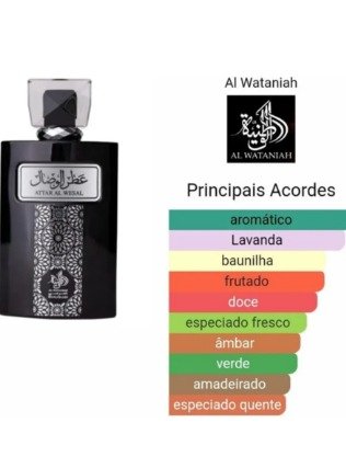 DescricaoPoderosamente sedutor, intensamente marcante.Attar Al Wesal e uma fragrancia masculina da prestigiada casa arabe Al Wataniah, criada para homens que exalam confianca e magnetismo natural. Combinando o frescor da lavanda, pera e menta, com o calor envolvente da canela e da baunilha negra, esse perfume revela um aroma amadeirado chipre moderno e exotico.Perfeito para noites especiais ou para quem deseja deixar sua marca por onde passa, o Attar Al Wesal carrega o luxo e o misterio do Oriente Medio em cada borrifada. Parte da refinada linha Dubai, traz a uniao entre o savoir-faire frances e a alma mistica oriental.Familia olfativa: Amadeirado ChipreNotas marcantes: Topo: Pera, Lavanda, Menta Corpo: Canela, Especiarias Fundo: Casca de Baunilha Preta, Notas AmadeiradasOrigem: Emirados Arabes UnidosVolume: 100mlIdeal para: Uso noturno, eventos especiais ou para destacar sua presenca no dia a dia.