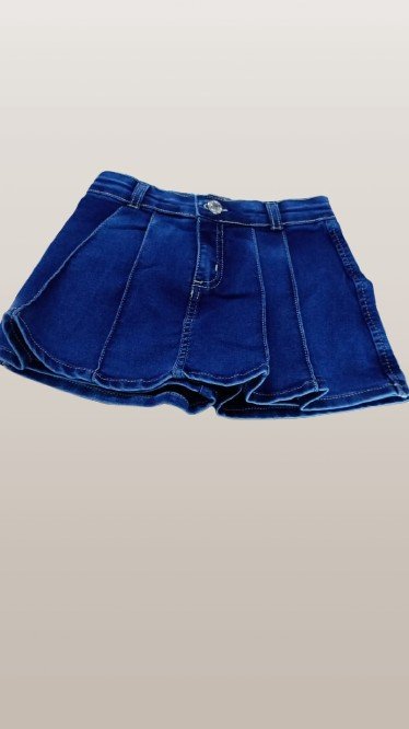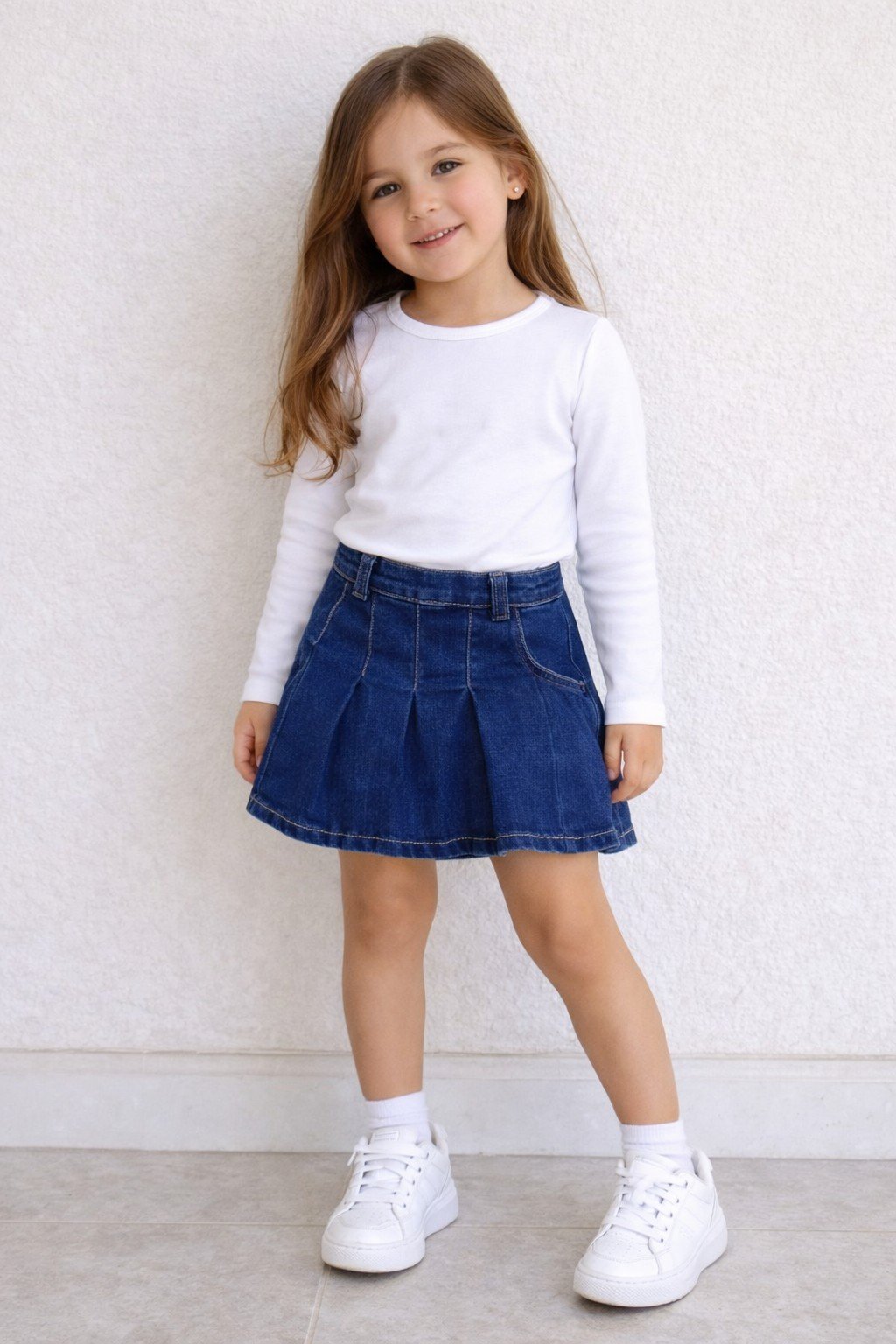 Saia infantil confeccionada em jeans com composicao 63% algodao, 32% poliester, 3% viscose e 2% elastano, oferecendo conforto, resistencia e leve elasticidade para melhor ajuste ao corpo.O modelo possui lavagem azul media, com pregas frontais que garantem um caimento soltinho e delicado. Conta com cintura com elastico, proporcionando praticidade ao vestir e maior conforto para o uso diario. O acabamento com pespontos contrastantes valoriza a peca e da um toque moderno.Ideal para compor looks casuais com blusinhas e tenis, sendo uma opcao versatil e confortavel para o dia a